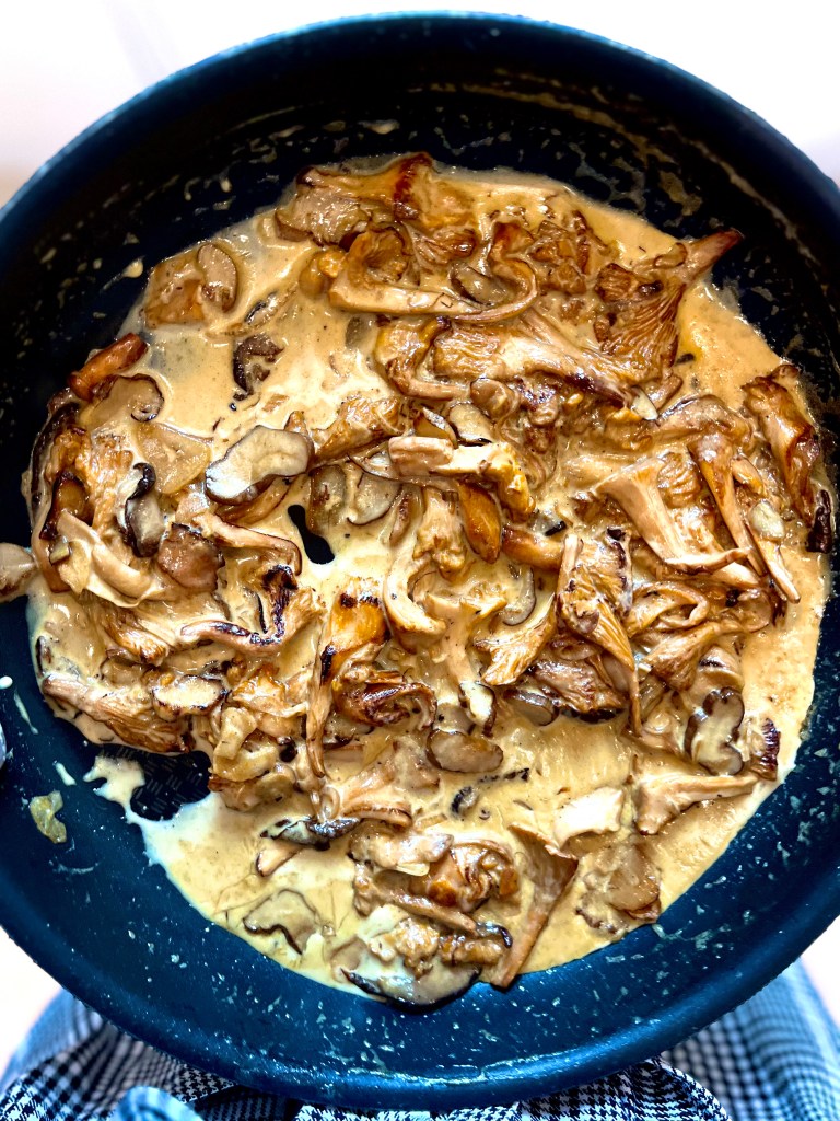 Chanterelles should now reduced their size by half after sweating. Add butter, stir to coat. Then add whipping cream, soy sauce and nutritional yeast, stir gently to combine. Reduce heat to low simmer, taste and season with salt.