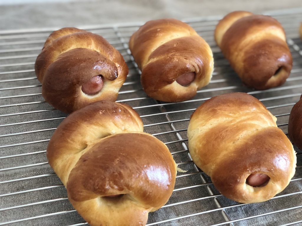 Prepare a lined baking sheet (you can use the same one to bake with later). On a lightly floured surface, roll each ball into a long tube, about 1.5 times the length of the sausages. Wrap each sausage in the dough tube using a spiral pattern, with the tubes slightly overlapping each other. (You want to make sure that 1 cm to 1.5 cm of the sausage shows through.) Repeat for the remaining dough and sausages. Space sausages about 1.5-2 inches apart so that they don’t bleed into one another as they rise, cover with cling film, and let rest for about 45 minutes.