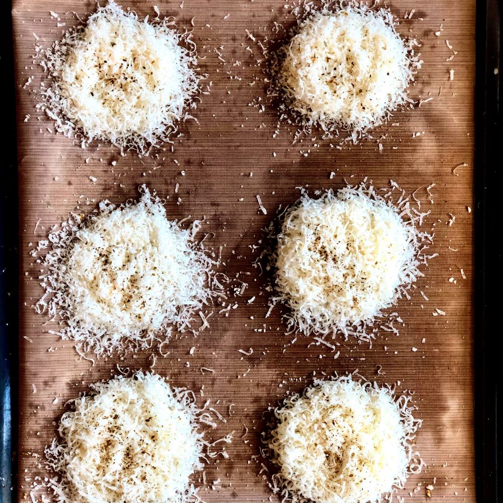 Use a fine grater (I use Microplane) and grate six individual Parmesan mountains onto the tray, keeping as much space between each mountain as possible.