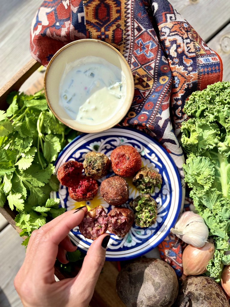 I also use potato starch to coat the falafels and it gives a touch of chew in them which I really enjoy. Except the legumes are only soaked and drained, other vegetables that I used in the falafels are cooked and this helps to bind better. They are great to make ahead in big batch and freeze uncooked, extra falafels for longer storage, up to 3 months. Simply deep-fry falafels directly from frozen until golden. They are delicious to serve in wrap or pita with tzatziki and hummus along with fresh salad inside.