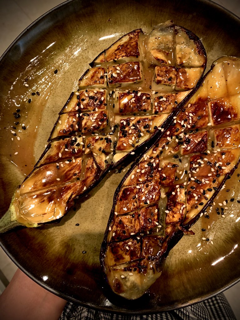 Remove baked eggplants onto serving plate, cut side up, and spoon over miso butter and sprinkle with dried chili flakes. Serve warm.