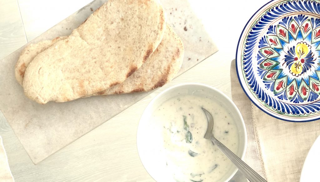 Mix remaining ingredients with cucumber, adjusting to taste with salt, pepper, and olive oil. Keep sauce in the fridge until serving. Serve with grilled meat, falafel (find recipe HERE) and pita/naan (find recipe HERE).